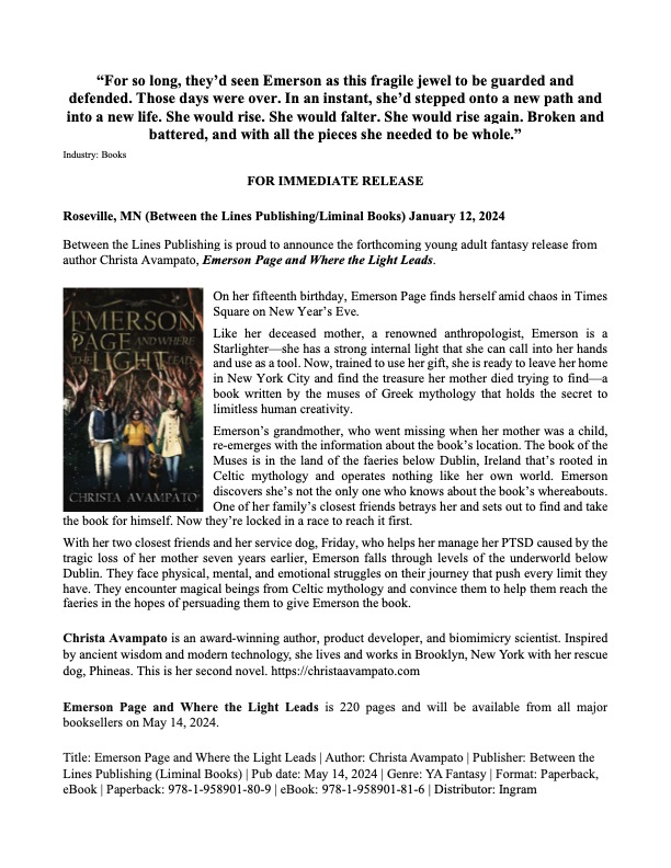 Another exciting book launch milestone! The press release and sell sheet for my novel, Emerson Page and Where the Light Leads, are complete and being sent out with the galley (watermarked book manuscript) to media for review. Please feel free to share these with any media contacts whom you think would be interested. Pre-order links will be available next week, and I’ll share those as soon as I have them. Thank you to everyone for all the support. It takes a village, and I’m glad I’m with you.