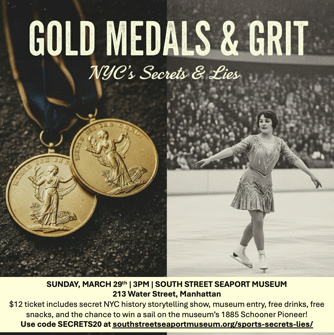 Buy your tickets at https://southstreetseaportmuseum.org/sports-secrets-lies/. Enter the code SECRETS20 after you put in your billing info and you’ll get the tickets for $12, which includes the show, museum entry, snacks, drinks, and the chance to win a sail on the museum’s 1885 Schooner Pioneer. Did you already buy your tix? Just let me know when you arrive and I’ll give you an extra set of lottery tickets for the prize drawing.