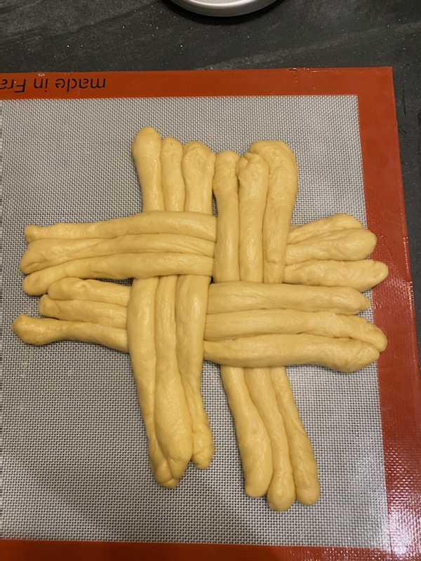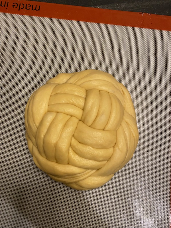 Then you get to braid. And the first time you do that it’s super intimidating because the dough is kind of weird. It springs back and you try to stretch it out. And it’s like, okay, I’ll make this and itโll be about 15 inches long. And suddenly, it’s about eight inches long. And you’re trying to figure out well, how do you do this, and then you realize, you can shape it into all kinds of creative shapes. There’s a tradition during Rosh Hashanah, the Jewish New Year, to make a circle loaf.