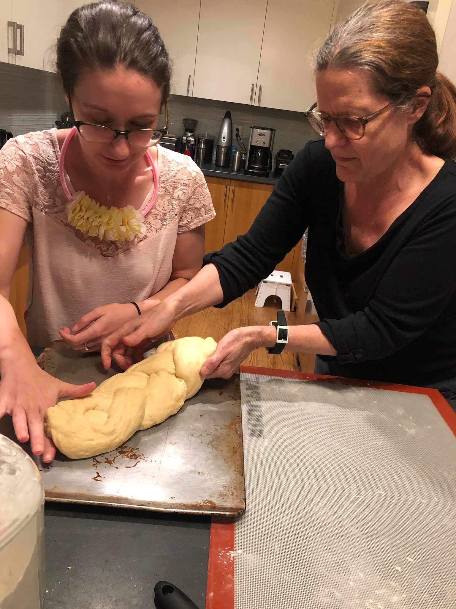 It was good. I think back to it now and I realized that we probably didn’t knead it quite long enough. But it was good. We have pictures of us very carefully lifting it from the baking mat onto the cookie sheet to bake it and it’s like both of us really looking terrified that it’s gonna break and now I just kind of one hand it. I have an image that gives me the courage to bake challahโit is a traditional Orthodox Jewish woman with a house full of kids. Go back in time so her house is not temperature sensitive, right? Not central air or heat. She’s juggling 1001 things, cooking on who knows what kind of oven. Yes, she’s turning out challah. And once you realize that then you know this has to be sort of forgiving. It takes a lot of the fear out of it.